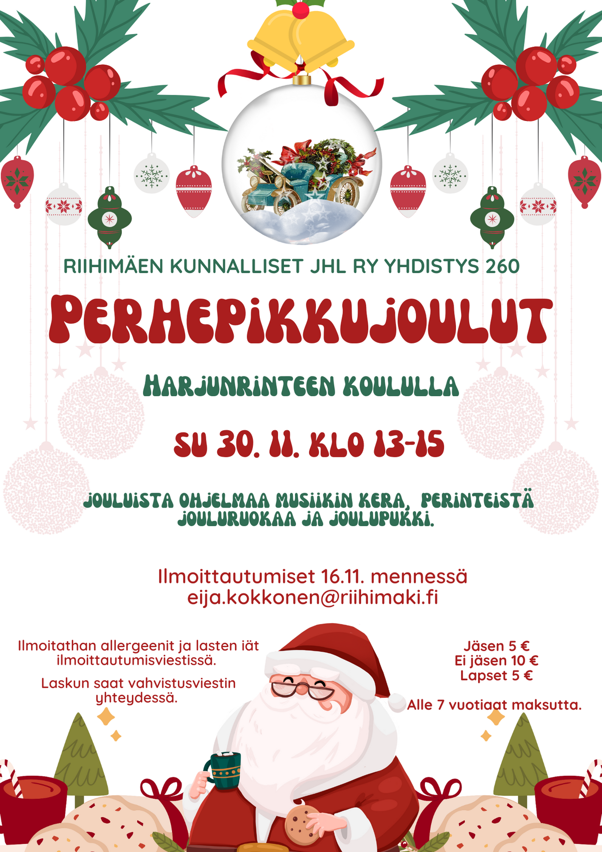 Ilmoittauduthan 15.11. mennessä Eijalle (eija.kokkonen@riihimaki.fi) ja kerrothan hänelle viestissä mahdollisen ruoka-allergeenit ja osallistuvien lasten iät. Vahvistusviestissä saat laskun, jonka eräpäivä on 19.11.2025.